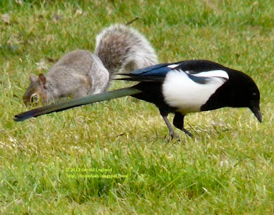 There are patches of yellow dandelions on the grassy area at Swain's Valley where a squirrel and a magpie were both foraging.